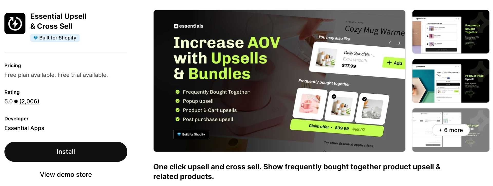 Essential Upsell & Cross Sell helps merchants leverage frequently bought together, related product recommendations, cart add-ons and one-click offers to increase AOV, particularly via intuitive automations and display widgets across product and cart pages.