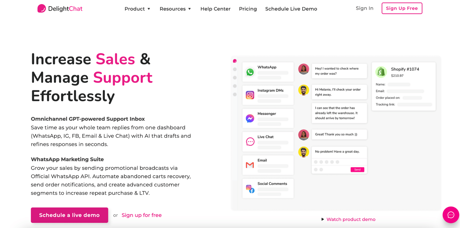 DelightChat is an omnichannel support helpdesk + WhatsApp marketing layer for Shopify brands—so you can run WhatsApp flows (cart recovery, broadcasts) while also managing support across WhatsApp, Instagram, email, and more.