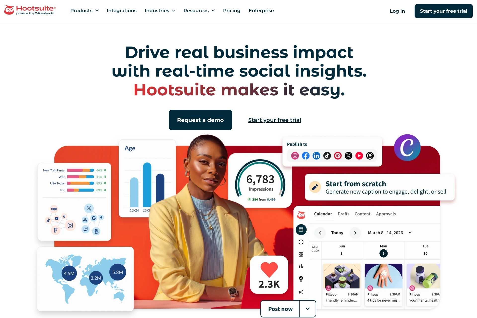 D2C brands live and die by their social presence, and managing content calendars, community engagement, and performance reporting across Instagram, TikTok, Facebook, LinkedIn, and Pinterest without a centralized platform creates operational drag that scales badly. Hootsuite, trusted by over 18 million users globally, gives marketing teams a single dashboard to schedule and publish content, monitor brand mentions, and analyze performance across all channels simultaneously — with team collaboration features built for brands with in-house social teams and multi-stakeholder approval workflows.
